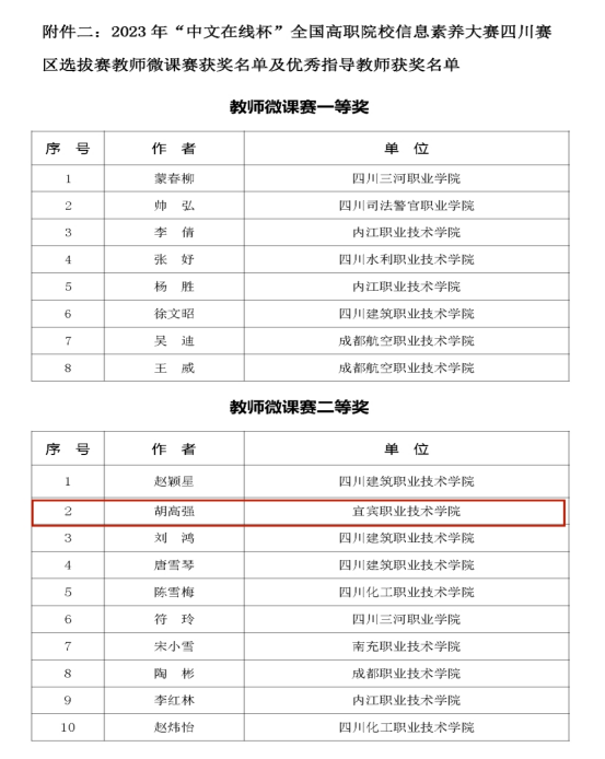 近日,2023年“中文在线杯”全国高职院校信息素养大赛四川赛区选拔赛教师微课赛圆满落幕。我院图书与信息中心胡高强老师荣获教师微课赛二等奖,张腾跃、陈进老师荣获“优秀指导教师”。